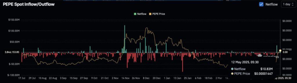 Berdasarkan data dari Coinglass, arus masuk/keluar PEPE di pasar spot menunjukkan netflow sebesar $10,52 juta ke bursa pada 12 Mei, disusul arus masuk sebesar $18,55 juta selama minggu lalu.