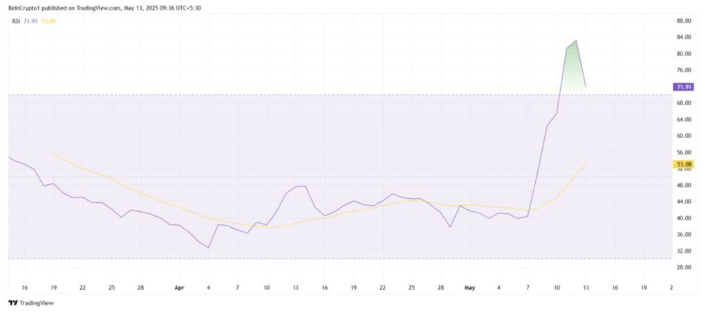 Indeks Kekuatan Relatif (RSI) untuk Pi Network telah melonjak melewati ambang batas 70,0, yang menandakan bahwa aset ini telah memasuki zona jenuh beli. Ini mengindikasikan bahwa momentum bullish mulai mencapai titik jenuh, yang secara historis bisa menjadi sinyal kemungkinan pembalikan arah.