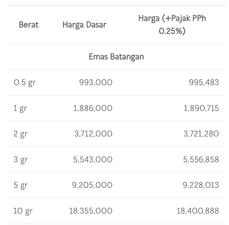 Menurut data dari website Logam Mulia per 14 Mei 2025, harga emas 10 gram adalah Rp18.355.000 sementara itu untuk harga pajak + pph 0,25% adalah Rp18.400.088.