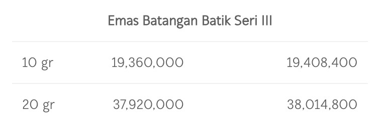 Tak hanya itu, di Logam Mulia juga menyediakan Emas Batangan Batik Seri III 10 gram dengan harga dasar Rp19.360.000 dan Rp19.408.400 untuk harga pajak + pph 0,25%.