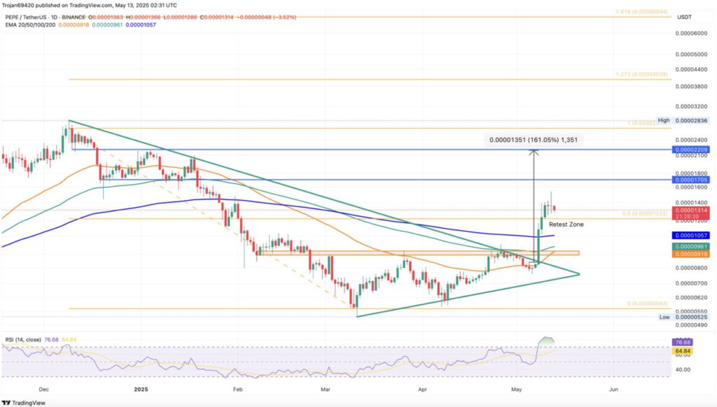 Sementara itu, indikator Relative Strength Index (RSI) mengalami sedikit penurunan namun masih berada di zona overbought, mengindikasikan adanya pelemahan momentum. Hal ini sejalan dengan kesulitan harga PEPE menembus resistance di sekitar $0,00001426, memperkuat kemungkinan terjadinya retest.