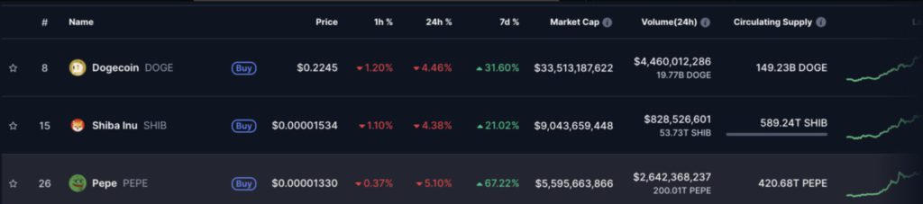 Memanfaatkan momentum pasar yang positif, harga PEPE melonjak hampir 68% dalam tujuh hari terakhir, sementara DOGE dan SHIB masing-masing hanya naik 32% dan 21%.