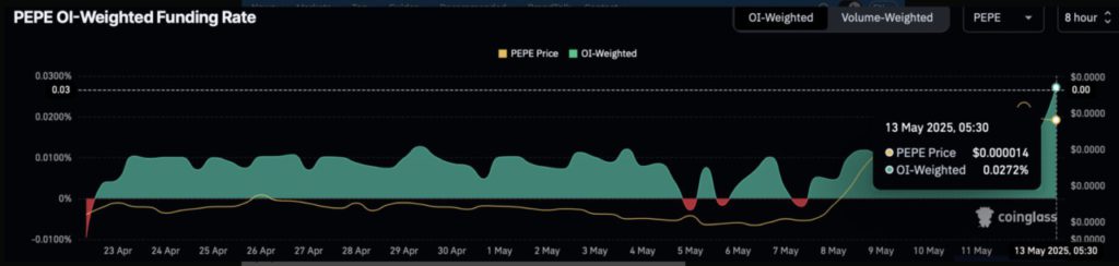 Tingkat pendanaan berbobot OI untuk PEPE juga mencapai rekor tertinggi tahun 2025 di angka 0,0272%, yang mencerminkan meningkatnya kepercayaan bullish dalam aktivitas perdagangan.
