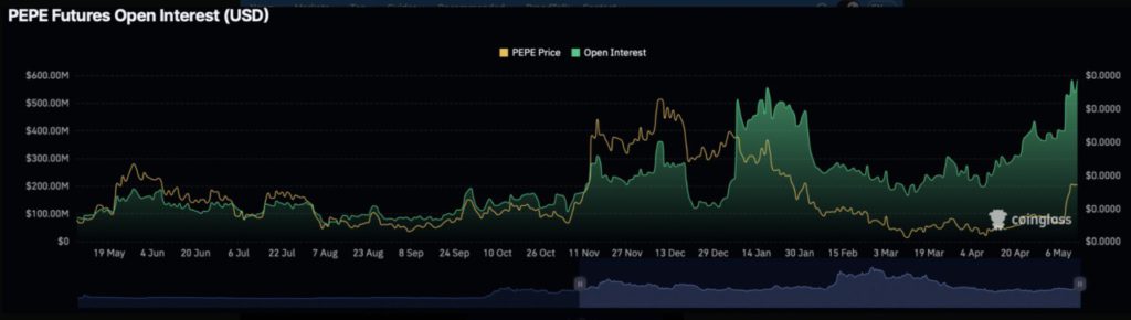 Lonjakan harga koin Pepe memicu peningkatan aktivitas perdagangan di pasar derivatif. Berdasarkan data dari Coinglass, Open Interest (OI) PEPE mencatatkan rekor tertinggi sepanjang masa sebesar $583 juta, seiring para trader bersiap menghadapi pergerakan tajam pada koin meme ini.