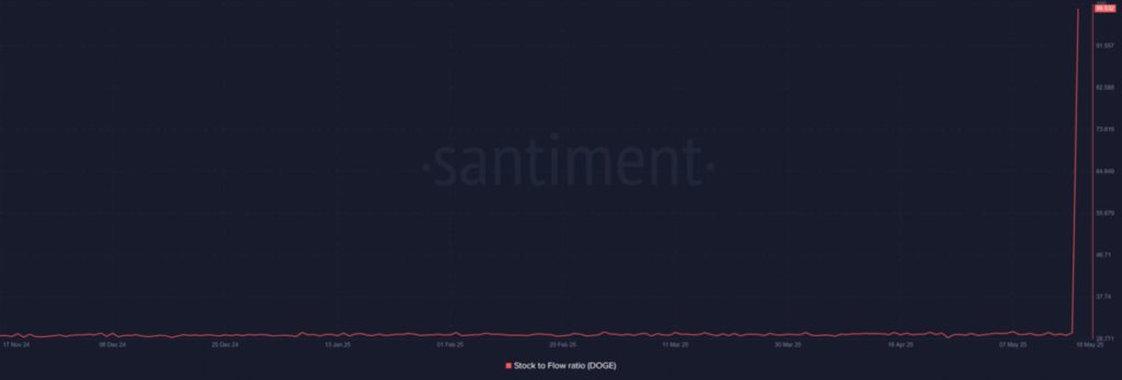 Rasio Stock-to-Flow Dogecoin (DOGE) telah mencapai angka yang sangat tinggi yaitu 99,53, menandakan bahwa pertumbuhan pasokan beredar telah melambat atau bahkan berhenti. Ini meningkatkan persepsi kelangkaan yang bisa mempengaruhi volatilitas harga.