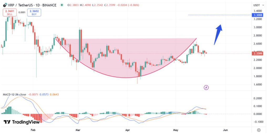 Menariknya, pola bullish “Cup and Handle” telah terbentuk sejak pertengahan Februari hingga pertengahan Mei. Dasar dari “cup” berada di sekitar $1,85, dengan puncaknya di kisaran $2,60.