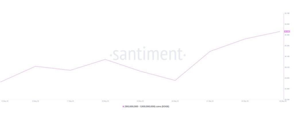 Koin meme terkemuka, Dogecoin , menjadi salah satu aset yang mendapat perhatian besar dari para whale kripto minggu ini. Data dari Santiment menunjukkan peningkatan jumlah DOGE yang dimiliki oleh alamat dompet yang memiliki antara 100 juta hingga 1 miliar token DOGE.