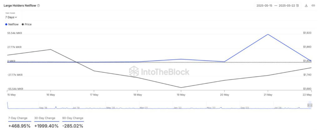 Hal ini terlihat dari data IntoTheBlock yang menunjukkan bahwa netflow pemegang besar MKR naik sebesar 469% dalam tujuh hari terakhir.