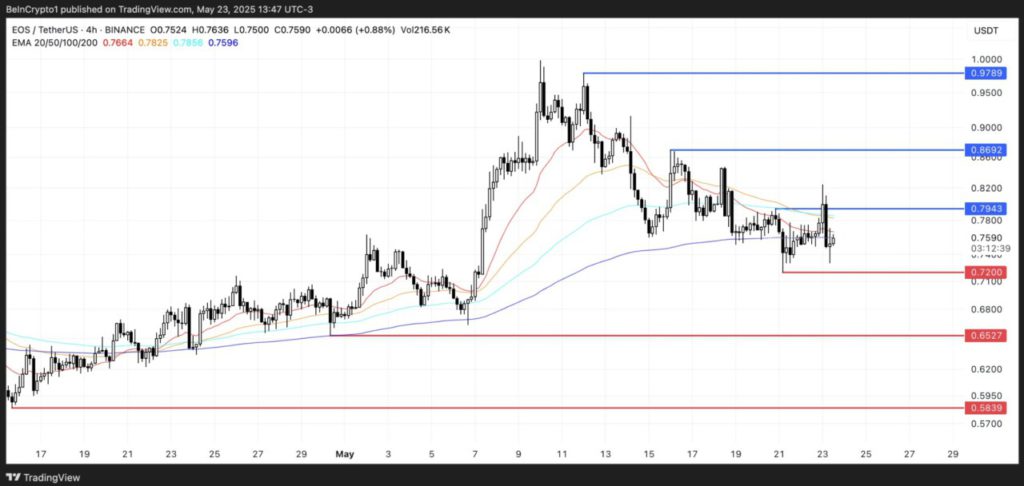 Namun sejak itu, EOS kesulitan mempertahankan momentumnya dan kini tercatat turun hampir 10,5% dalam tujuh hari terakhir. Token ini baru saja gagal menembus resistensi di $0,79 dan kini berada dalam risiko penurunan lanjutan.