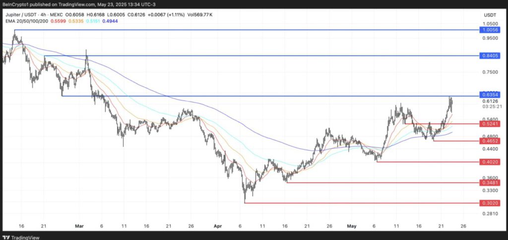 Secara teknikal, JUP masih berada di bawah level resistensi penting di $0,635, yang baru-baru ini gagal ditembus.