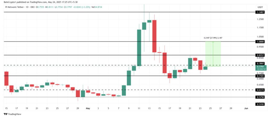 Dengan harga saat ini di angka $0,77, Pi Network perlu naik sekitar 28% untuk kembali mencapai level $1,00.