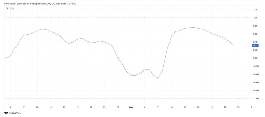 Harga Pi Network juga menunjukkan korelasi yang melemah dengan Bitcoin, dengan nilai korelasi saat ini sebesar 0,25 dan terus menurun. Korelasi yang rendah dan semakin melemah ini menunjukkan bahwa pergerakan harga PI mulai bersifat independen dan tidak lagi banyak mengikuti pergerakan Bitcoin.