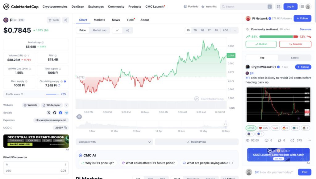 Grafik di atas menunjukkan pergerakan harga harian (1D) untuk Pi Coin (PI) per tanggal 26 Mei 2025 di platform CoinMarketCap. Harga saat ini berada di angka $0.7845 atau sekitar Rp12.833 (menggunakan kurs Rp16.363 per USD), mengalami kenaikan +1.57% dalam 24 jam terakhir. Kapitalisasi pasar Pi Coin tercatat sebesar $5.68 miliar (Rp92,96 triliun), dengan volume perdagangan harian sebesar $88.28 juta (Rp1,44 triliun) yang mengalami penurunan sebesar 17.78%.