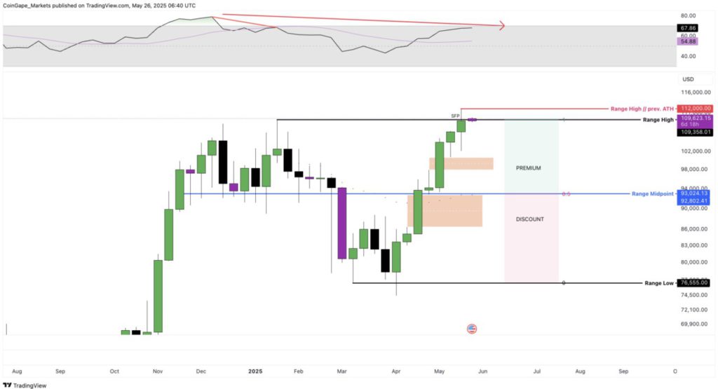 Penutupan candlestick mingguan menunjukkan bahwa harga Bitcoin (BTC) sempat menembus rekor tertinggi sebelumnya di $110.000, namun gagal ditutup di atas level tersebut.