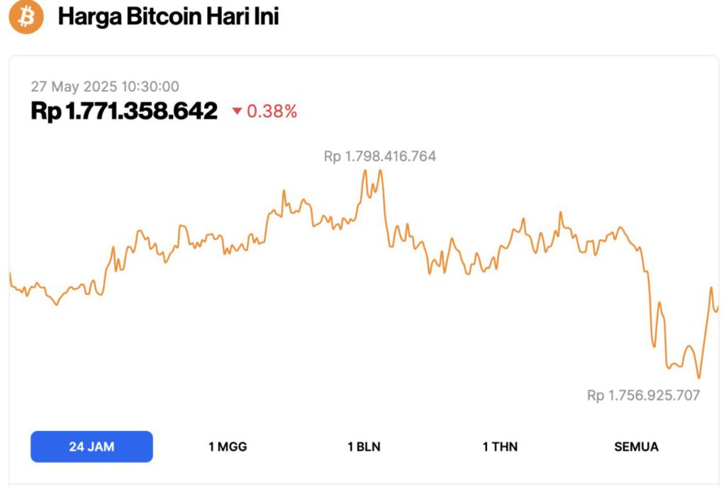 Pada 27 Mei 2025, harga Bitcoin tercatat berada di level $108,955 atau setara dengan Rp1.771.358.642, mengalami koreksi tipis 0,38% dalam 24 jam terakhir. Sepanjang periode ini, BTC sempat menyentuh level tertingginya di Rp1.798.416.764, dan harga terendahnya di Rp1.756.925.707.
