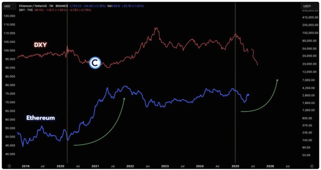 Dalam grafik perbandingan yang ia bagikan, puncak DXY (garis merah) secara historis sering bertepatan dengan titik terendah Ethereum (garis biru).
