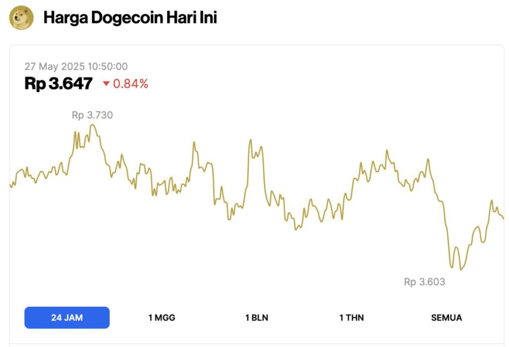 Pada 27 Mei 2025, harga Dogecoin tercatat mengalami koreksi tipis 0,84% dalam waktu 24 jam, diperdagangkan pada harga $0.2246 atau setara dengan Rp3.647. DOGE sempat berada di level tertingginya di Rp3.730 dan level terendahnya di Rp3.603.
