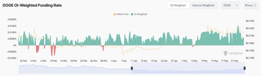 Selain itu, Open Interest Weighted Funding Rate DOGE terus menunjukkan kenaikan, kini berada di angka 0,0047%.