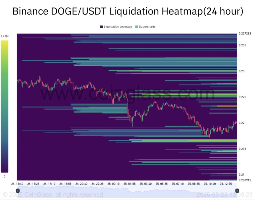 Faktanya, Liquidation Heatmap DOGE menunjukkan adanya klaster aktif di atas harga saat ini. Zona kuning pada peta tersebut mencerminkan potensi likuidasi senilai hampir $1,4 juta.