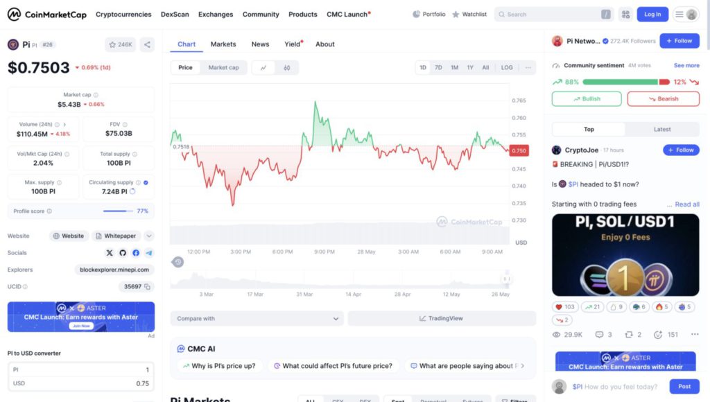 Grafik di atas menunjukkan pergerakan harga harian Pi Network (PI) pada tanggal 28 Mei 2025 berdasarkan data dari CoinMarketCap.