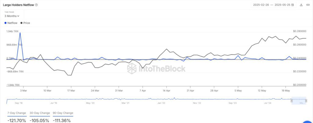 Meskipun TVL TRON menunjukkan peningkatan, data arus netto pemegang besar memberikan gambaran yang berbeda. Dalam 90 hari terakhir, arus netto whale menurun sebesar 111,36%, dan dalam 7 hari terakhir, penurunan tersebut bahkan lebih tajam, mencapai 121,7%.