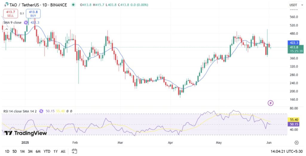 Setelah mengalami penurunan tajam dari kisaran $500, Bittensor mulai menunjukkan tanda-tanda awal stabilisasi. Aset ini menemukan support di area sekitar $407, dan para pembeli sedang berupaya untuk merebut kembali zona $420–$425.