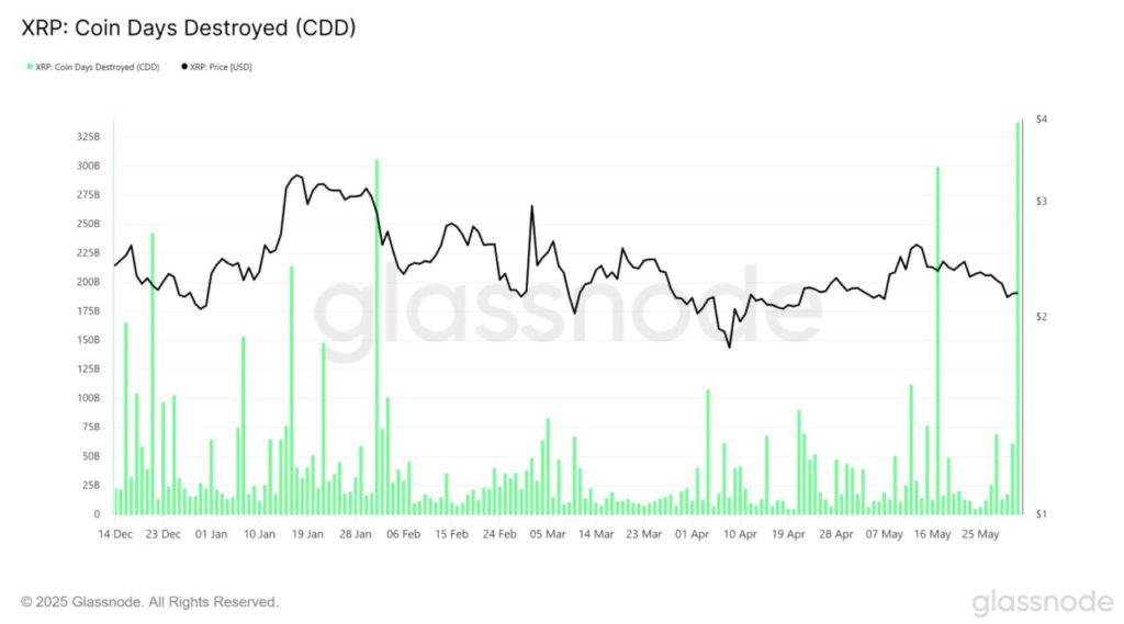 Saat ini, CDD XRP mencapai 337 miliar—level tertinggi sejak Desember 2024. Lonjakan ini menunjukkan bahwa banyak LTH mulai menjual kepemilikan XRP mereka, kemungkinan besar untuk mengamankan keuntungan sebelum harga turun lebih jauh.