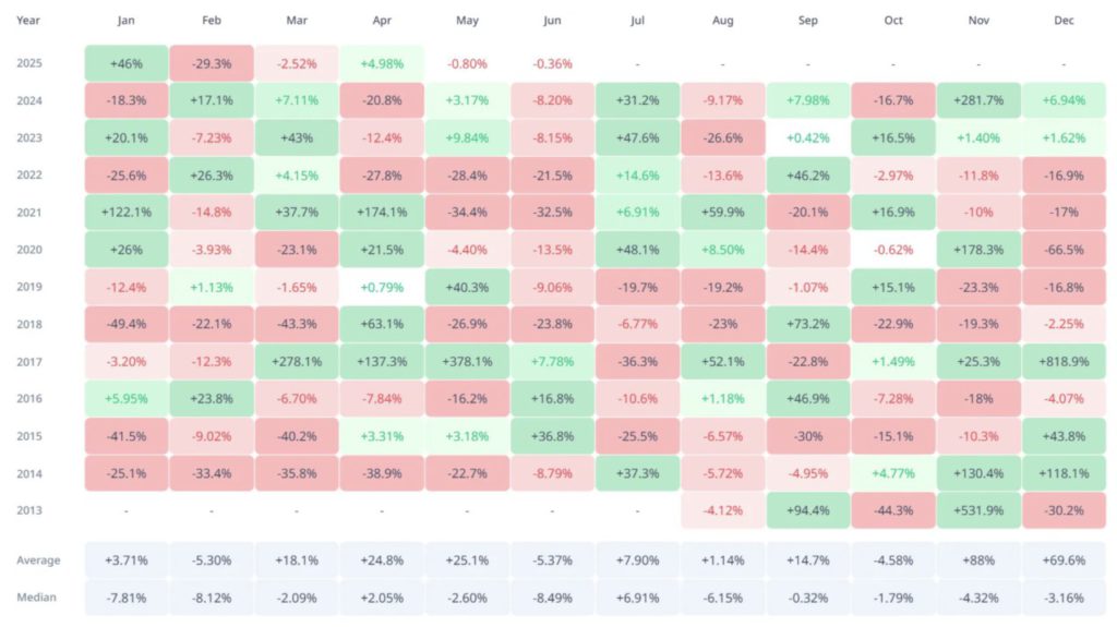 Secara historis, bulan Juni merupakan periode yang cukup menantang bagi para investor XRP. Data selama 11 tahun terakhir menunjukkan bahwa median return bulanan XRP di bulan Juni adalah -8,49%.