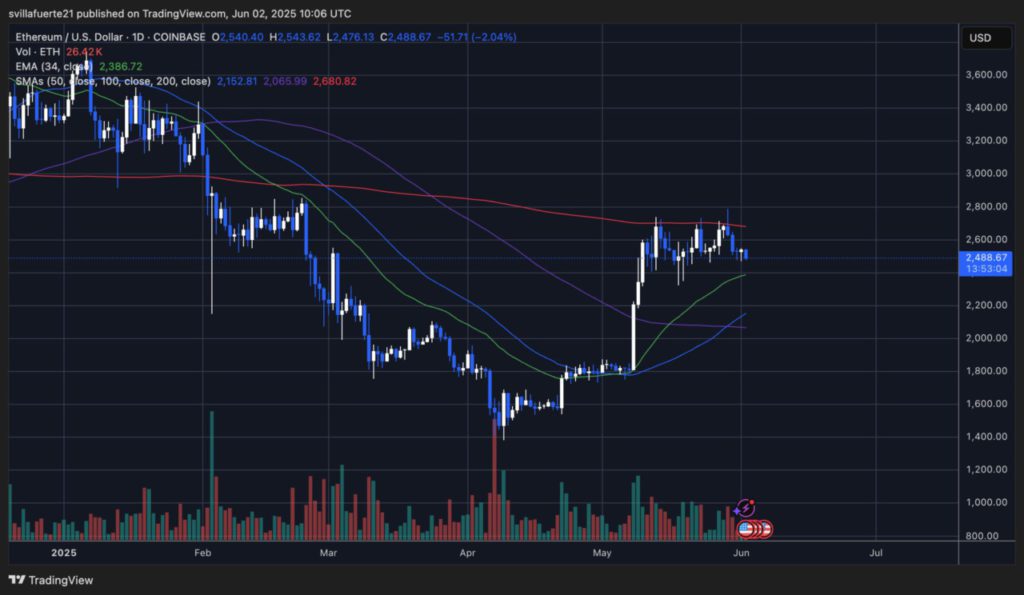 Dalam beberapa minggu terakhir, Ethereum menunjukkan pola konsolidasi yang jelas antara level $2.470 dan $2.700. Harga berkali-kali mencoba naik, namun selalu tertahan oleh rata-rata bergerak jangka panjang seperti 200-day SMA di sekitar $2.680 (Rp43,68 juta).