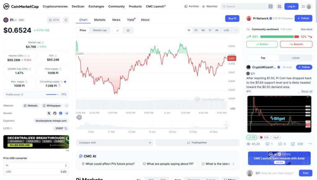 Halaman ini menunjukkan bahwa harga Pi saat ini berada di $0.6524, mengalami kenaikan sebesar 0.73% dalam 1 hari terakhir. Kapitalisasi pasar (market cap) Pi tercatat sekitar $4.76 miliar, dengan volume perdagangan 24 jam sebesar $69.26 juta, meskipun mengalami penurunan 17.52%.