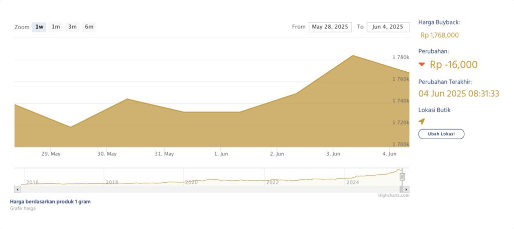 Pada awal periode (28 Mei), harga berada di kisaran sekitar Rp1.760.000, kemudian sempat turun ke titik terendah sekitar Rp1.710.000 pada tanggal 29 Mei. Setelah itu, harga kembali naik dan mencapai puncak tertinggi di atas Rp1.780.000 pada tanggal 3 Juni. Namun, pada hari terakhir (4 Juni 2025), harga buyback tercatat mengalami penurunan sebesar Rp16.000, sehingga menetap di angka Rp1.768.000 pada pukul 08:31 WIB.