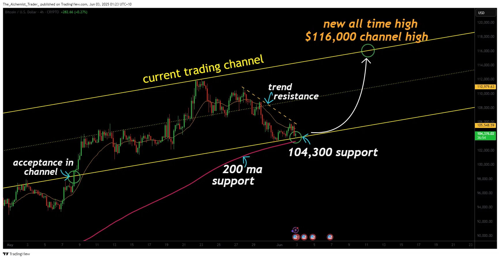 Penolakan di $111.900 sejalan dengan resistensi kanal, sementara penundaan saat ini di $104.300 telah menghasilkan candle bullish yang kuat, menandakan bahwa pembeli mempertahankan level ini.
