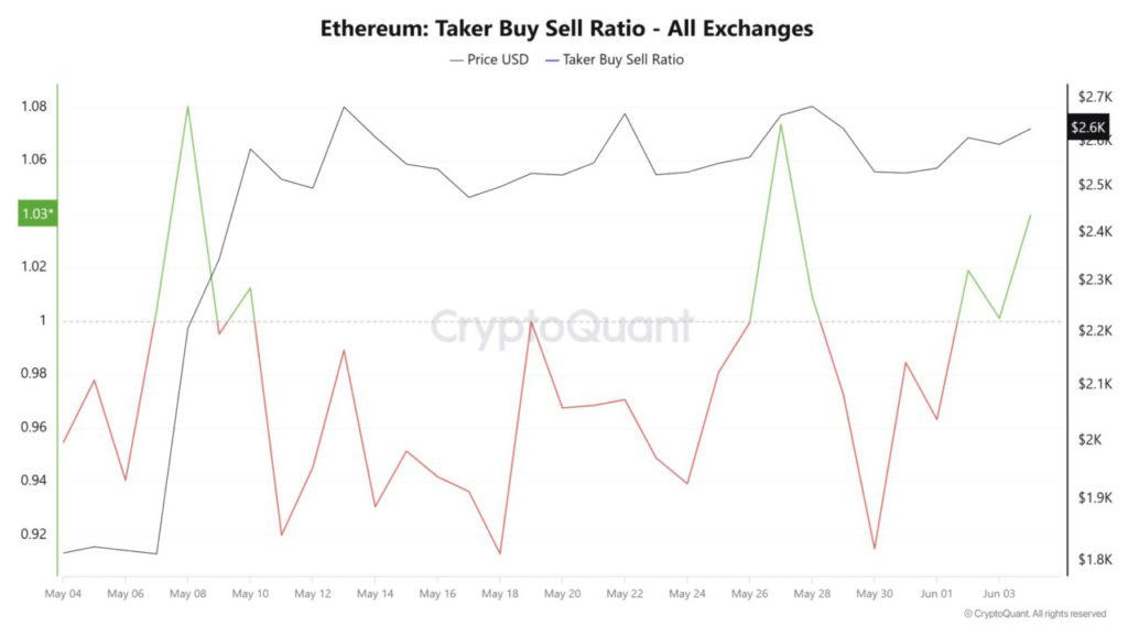 Aktivitas pembelian yang meningkat telah membuat para pembeli mendominasi pasar dalam 24 jam terakhir (4/6/25). Oleh karena itu, ETH Taker Buy-Sell Ratio berubah menjadi positif.