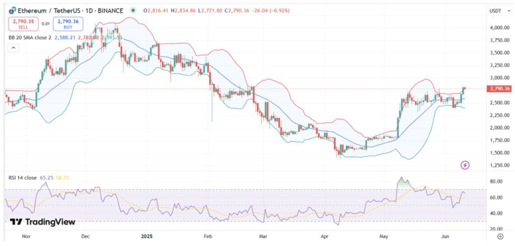 Pada chart harian ETH yang dibagikan laman Coinspeaker (11/6), harga ETH berhasil menembus batas atas Bollinger Band di sekitar $2.782, sebuah sinyal bullish yang menunjukkan momentum naik yang kuat.