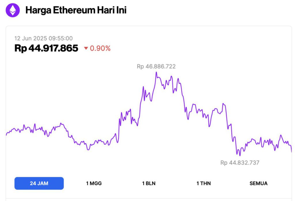 Per 12 Juni 2025, harga Ethereum (ETH) tercatat berada di sekitar $2,759 atau setara dengan Rp44.917.865, mengalami koreksi 0,90% dalam 24 jam terakhir. Sepanjang periode ini, ETH sempat menyentuh level tertingginya di Rp46.886.722, dan level terendahnya di Rp44.832.737.
