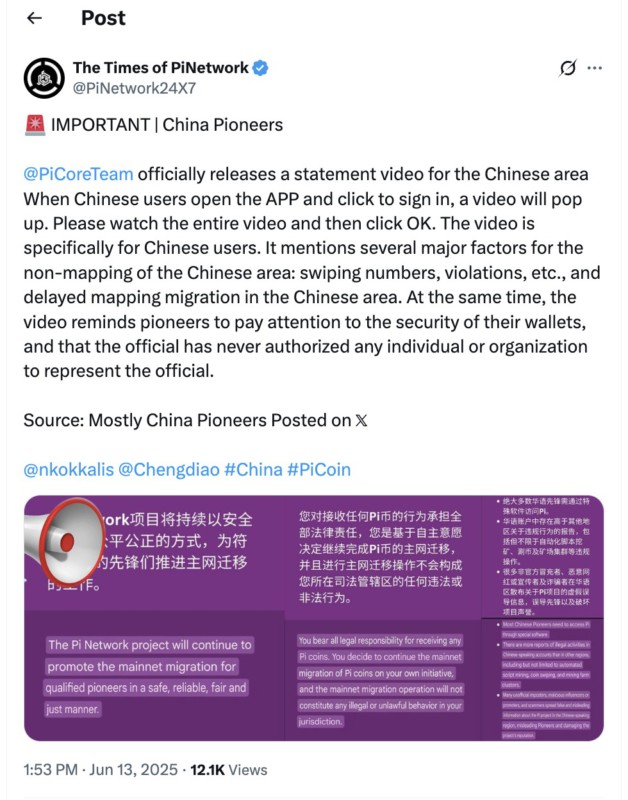 Pi Network telah memperkenalkan sebuah video yang harus ditonton oleh pengguna di China sebelum mereka dapat mengakses aplikasi. Video ini berisi informasi penting mengenai keamanan dan transparansi, serta mengingatkan bahwa PiCoreTeam tidak pernah menunjuk siapa pun atau entitas mana pun untuk bertindak atas nama mereka.