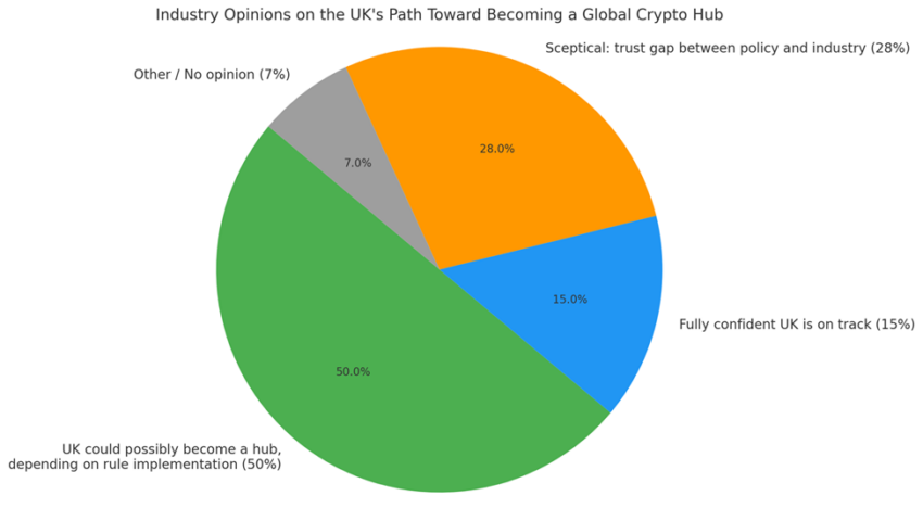 Meskipun ada optimisme tinggi, sebuah survei yang melibatkan 150 profesional kripto dan keuangan menunjukkan bahwa hanya 15% yang percaya Inggris berada di jalur yang tepat. Namun, 50% dari responden melihat potensi bagi Inggris untuk menjadi pusat kripto global, dan hanya 9% dari perusahaan yang disurvei menyatakan bahwa mereka sepenuhnya siap untuk rezim yang akan datang.