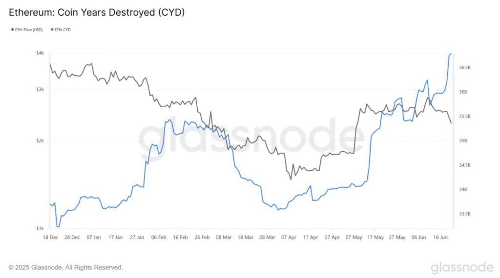 Coin Years Destroyed (CYD) Ethereum melonjak ke level tertinggi dalam enam bulan terakhir. Lonjakan ini mengindikasikan bahwa koin-koin lama yang sebelumnya tidak aktif, tiba-tiba kembali bergerak.
