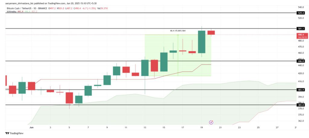 Level resistensi kunci untuk BCH adalah $501, harga yang belum pernah ditembus sejak Desember 2024. Indikator Ichimoku Cloud menunjukkan momentum bullish yang kuat, mengisyaratkan bahwa BCH mungkin mampu menembus resistensi tersebut.