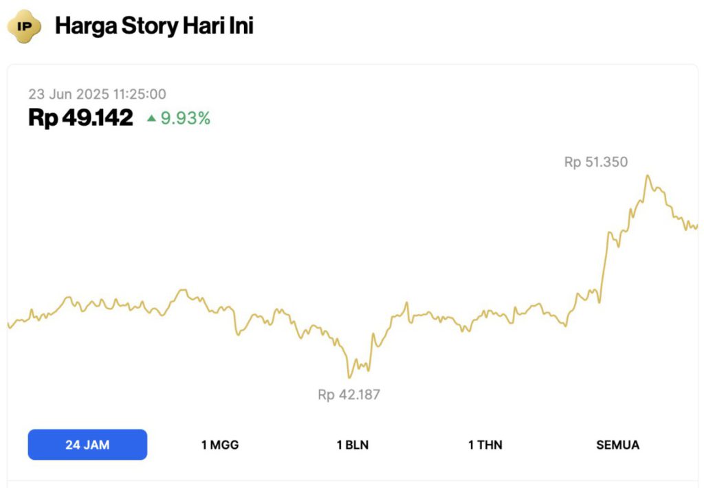 Grafik di atas memperlihatkan pergerakan harga Story dalam 24 jam terakhir hingga pukul 11:25 WIB pada 23 Juni 2025. Saat ini, harga Story berada di level Rp49.142, mencatat kenaikan harian sebesar +9,93%, menjadikannya salah satu aset crypto dengan performa positif pada hari ini.