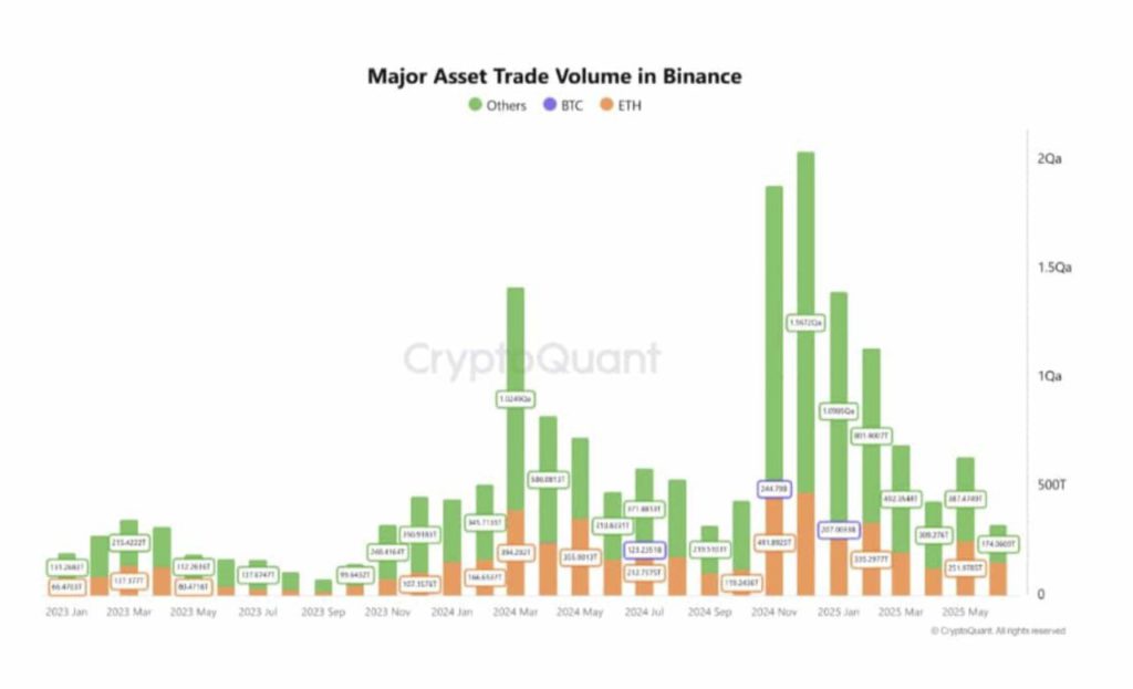 Sebaliknya, volume perdagangan altcoin sempat mencapai puncaknya di angka 1,5672 kuadriliun pada November 2024, namun turun tajam menjadi hanya 387,47 triliun pada Mei 2025. Pangsa perdagangan altcoin merosot dari lebih dari 1 kuadriliun menjadi di bawah 400 triliun, mencerminkan penurunan yang signifikan.
