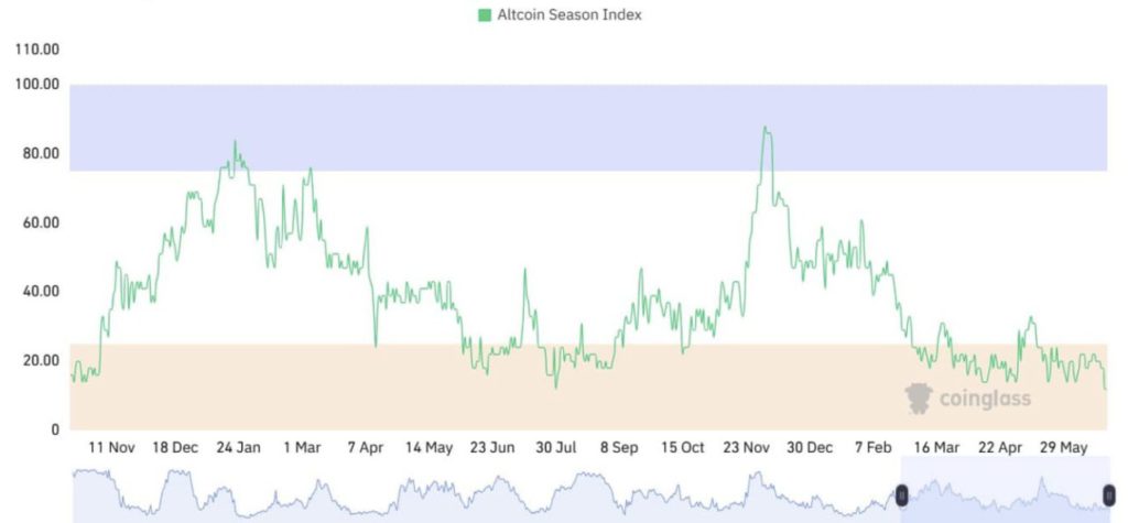 Jika kita melihat Altcoin’s Season Index, terlihat bahwa pasar altcoin secara keseluruhan mengalami penurunan. Indeks ini turun dari angka 88 ke 12 antara Desember 2024 dan Juni 2025, yang menandakan melemahnya pasar altcoin.