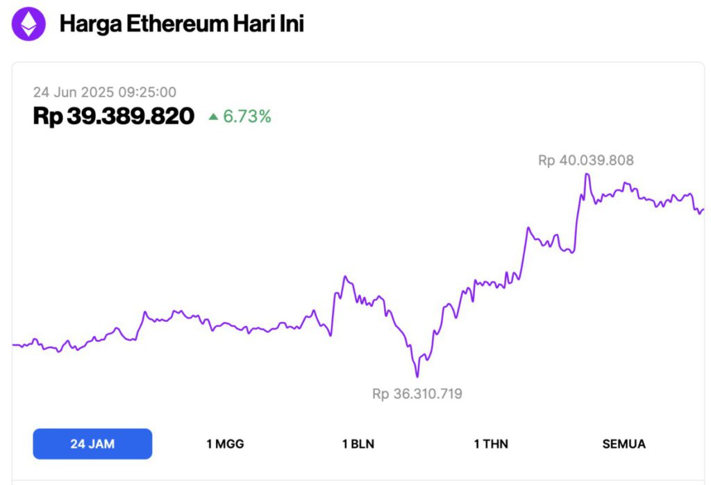 Per 24 Juni 2025, harga Ethereum tercatat berada di sekitar $2,400 atau setara dengan Rp39.389.820, mengalami kenaikan 6,73% dalam 24 jam terakhir. Sepanjang periode ini, ETH sempat menyentuh level terendahnya di Rp36.310.719, dan level tertingginya di Rp40.039.808.