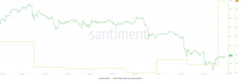 Per 23 Juni, rasio NVT (Network Value to Transactions) Ethereum melonjak ke angka 1041, yang menunjukkan adanya penilaian jaringan yang terlalu tinggi (overvaluation).