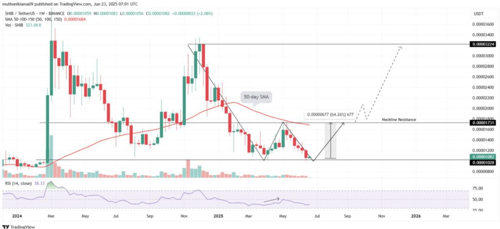 Sejak tren penurunan yang dimulai pada Desember 2024, SHIB telah dua kali mempertahankan level dukungan ini, yang kemudian membentuk pola double bottom. Terakhir kali harga memantul dari level ini terjadi pada April 2025, dan reli yang dihasilkan menciptakan neckline resistance di $0,0000173.