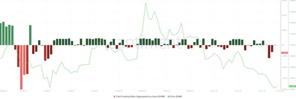 Tingkat pendanaan (funding rate) Shiba Inu, sebuah metrik yang digunakan untuk mengukur sentimen pasar, kini telah berbalik menjadi negatif. Ketika hal ini terjadi, biasanya membentuk narasi bearish terhadap proyeksi harga Shiba Inu karena semakin banyak pedagang yang bertaruh harga akan turun dengan membuka posisi short.