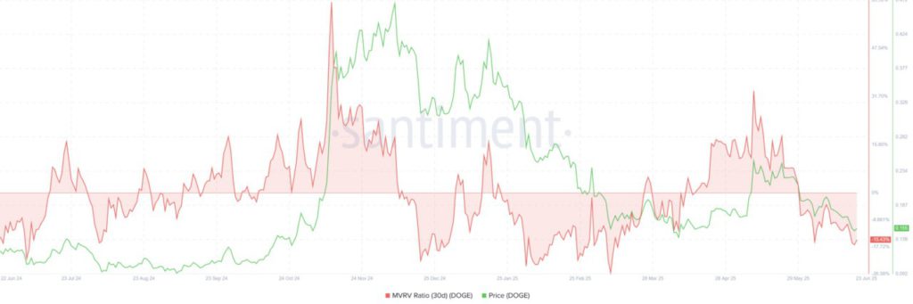 Rasio Market Value to Realized Value (MVRV) 30 hari Dogecoin menunjukkan bahwa harga DOGE mungkin telah mencapai titik terendah, dan pemulihan bisa segera terjadi.
