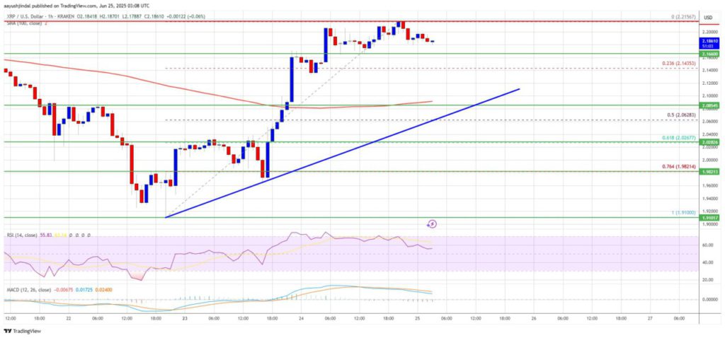Ripple (XRP) baru-baru ini memulai peningkatan dari zona $2,050, berhasil menembus kembali di atas $2,10. Namun, Ripple (XRP) menghadapi kesulitan untuk melanjutkan kenaikan di atas zona $2,20. Meskipun berhasil melewati beberapa level resistensi seperti $2,020 dan $2,080, serta sempat menyentuh di atas $2,20, tekanan jual di atas zona tersebut cukup kuat. Puncak harga tercatat di $2,215 sebelum akhirnya harga mulai mengalami koreksi.