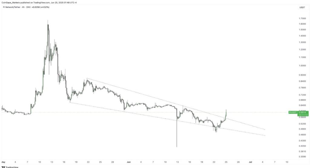 Pi Coin mengalami kenaikan tajam setelah berhasil menembus resistensi dari pola wedge menurun yang telah terbentuk selama beberapa minggu terakhir. Kenaikan dari $0,47 ke $0,62 dalam beberapa hari menunjukkan bahwa ada peningkatan minat dan aktivitas pembelian yang signifikan di pasar.