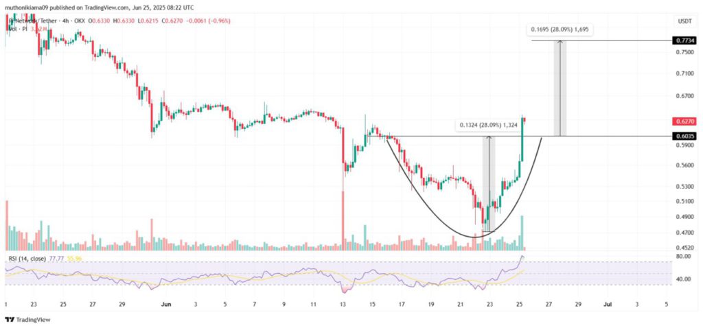Selain pola wedge yang bullish, ada juga pola dasar bulat yang telah matang pada grafik empat jam Pi Coin. Pola ini juga mengindikasikan bahwa pembalikan tren bullish semakin dekat. Penutupan harga di atas level resistensi leher menambah bukti akan kekuatan tren naik yang sedang terbentuk.